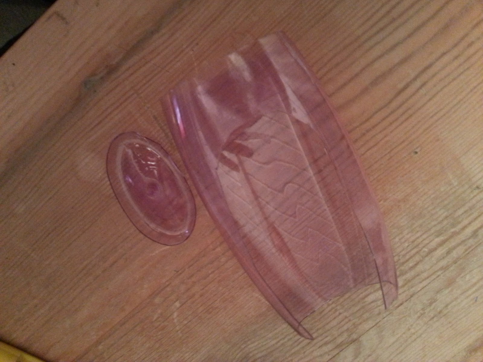 Så skar jeg av ene siden men rundet av i en bue i bunn…altså skjærte ikke helt ned til bunn. Rundet av litt før der hvor etiketten sluttet. (her kan det være litt bedre å bruke saks)