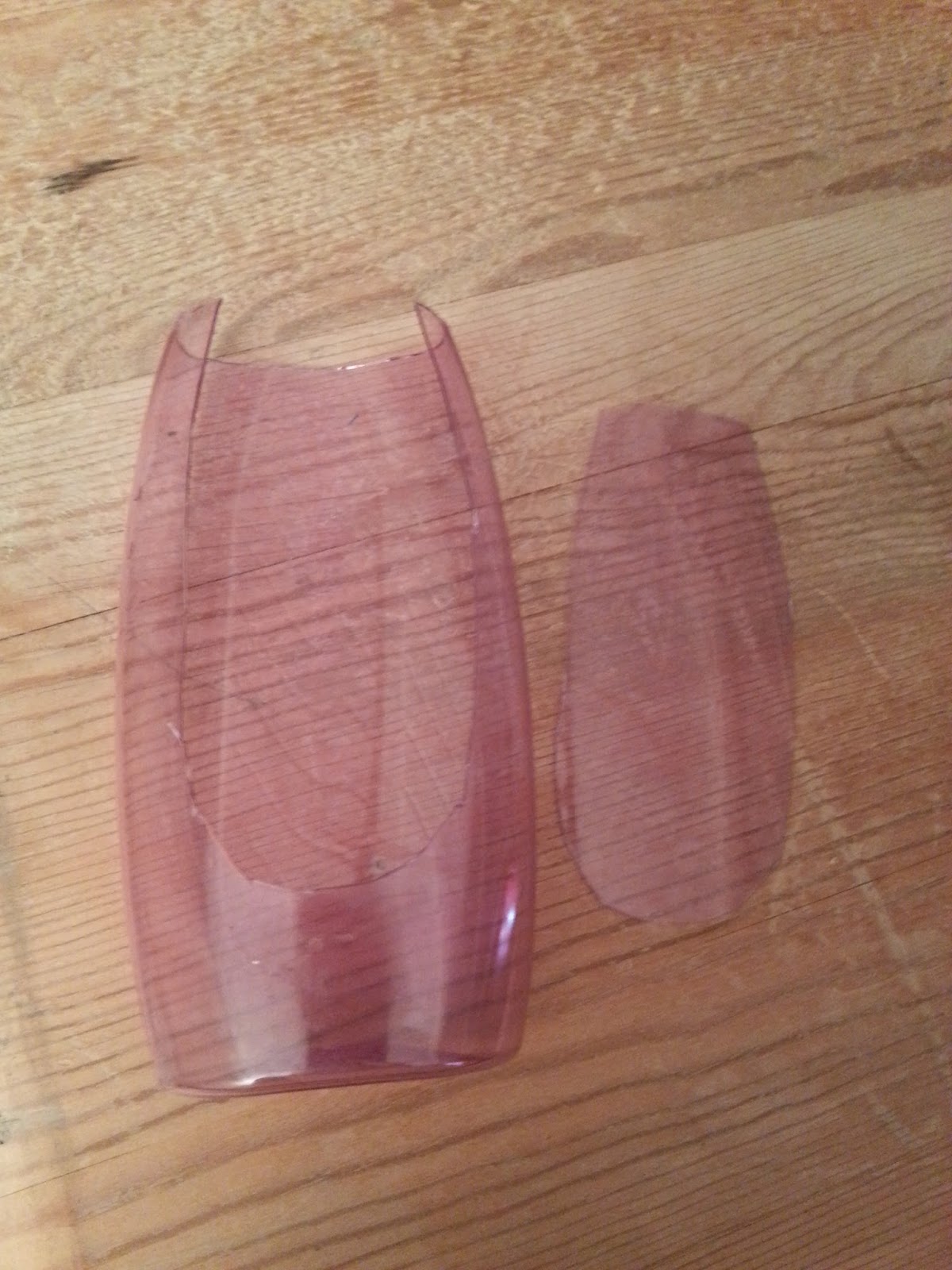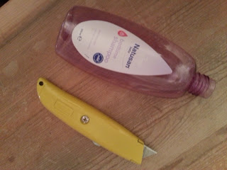 Så skar jeg av ene siden men rundet av i en bue i bunn…altså skjærte ikke helt ned til bunn. Rundet av litt før der hvor etiketten sluttet. (her kan det være litt bedre å bruke saks)